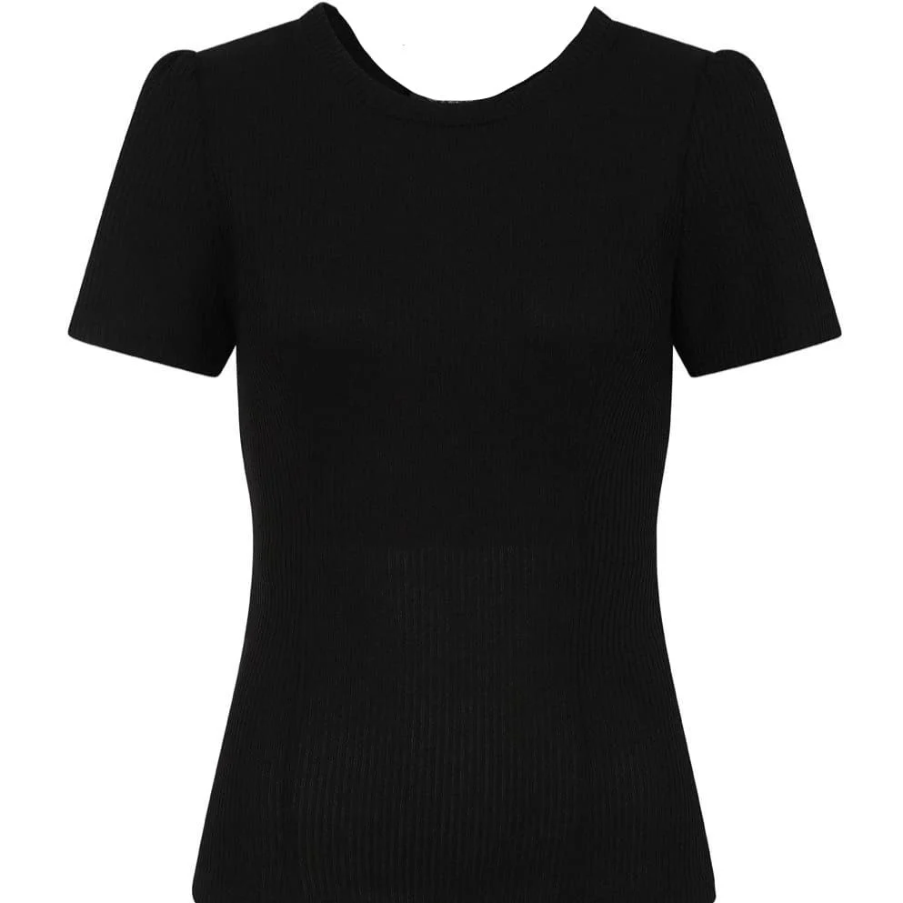 - Black Ribbed Knit Top With Princess Seams and Puffed Sleeves For That Added Touch