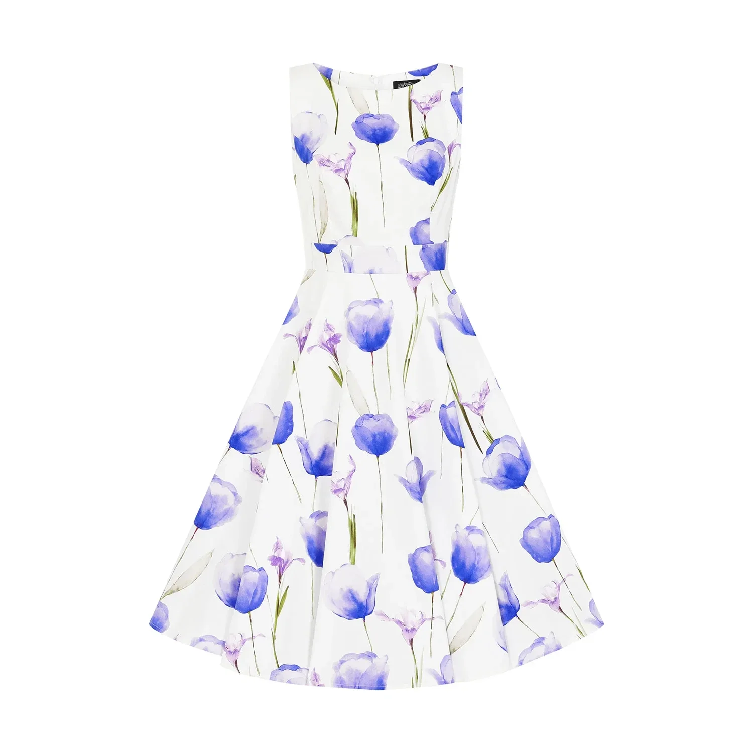 This charming 50s-inspired dress boasts a stunning white floral print on luxurious stretch cotton fabric for ultimate comfort. The delicate purple floral design adds a touch of whimsy, while a boat neckline, waistband, and pockets make it both practical and stylish. Want even more flare? Add a petticoat! And with a concealed back zip, you'll look effortlessly chic.