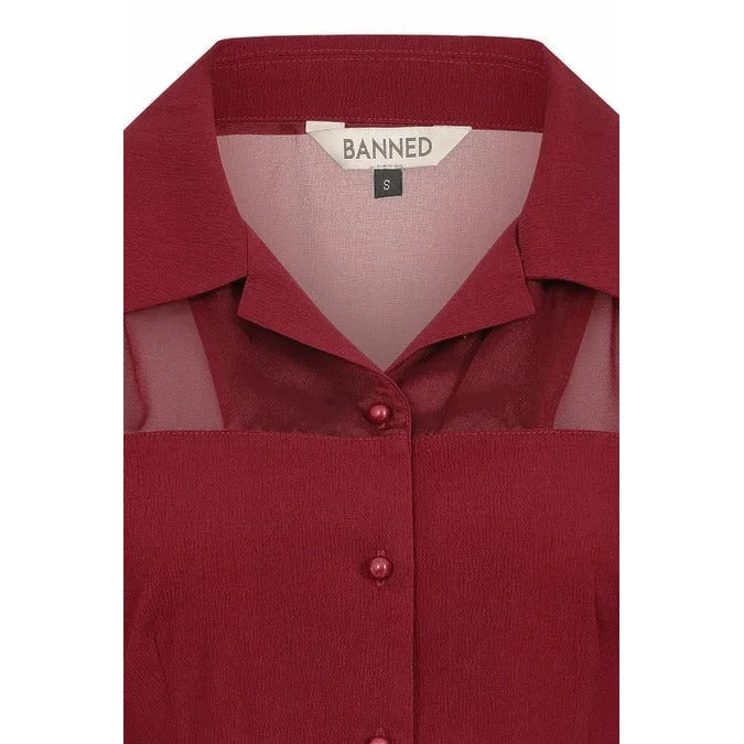 This 50s-inspired blouse exudes a romantic vintage charm, featuring a contrasting neckline and delicately elasticated sleeves finished with a gentle frill. Designed with darts for a flattering fit and a contrasting collar, it promises to be an elegant essential for anyone who appreciates timeless retro style. Gorgeous Burgundy Red Shade.