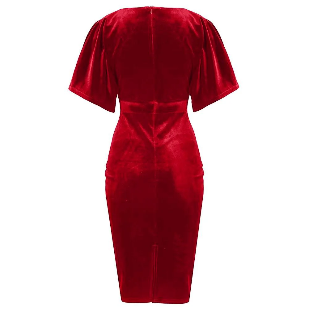 Red Velour Half Batwing Sleeve Crossover Top Wiggle Dress