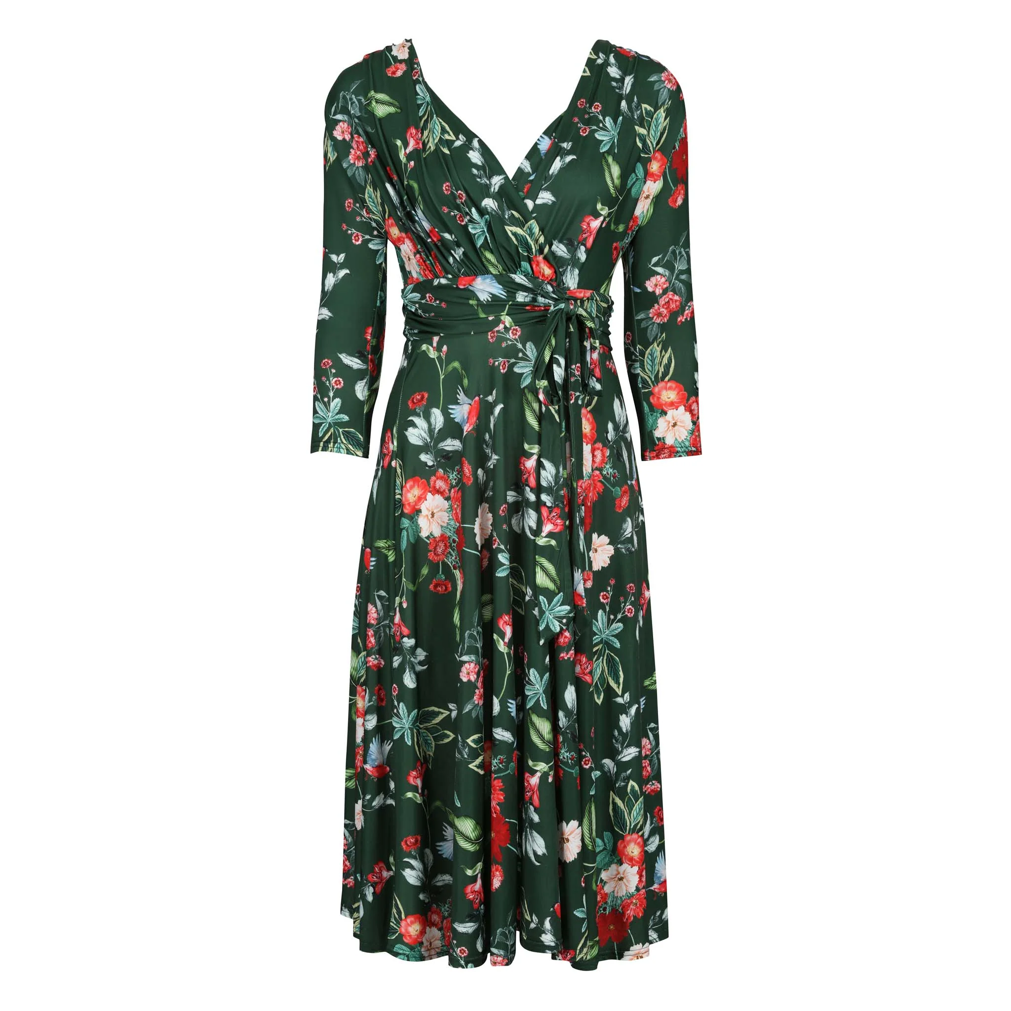 Green Floral & Bird Print 3/4 Sleeve V Neck Crossover Top Tea Dress