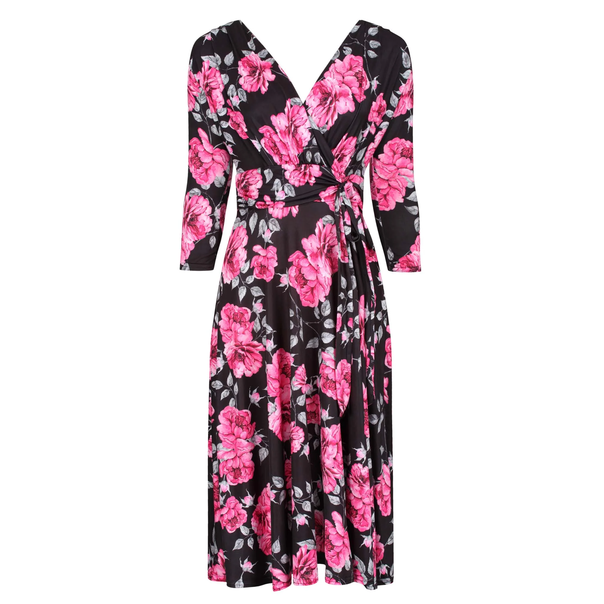 Black And Floral 3/4 Sleeve V Neck Crossover Top Empire Waist Tea Dress
