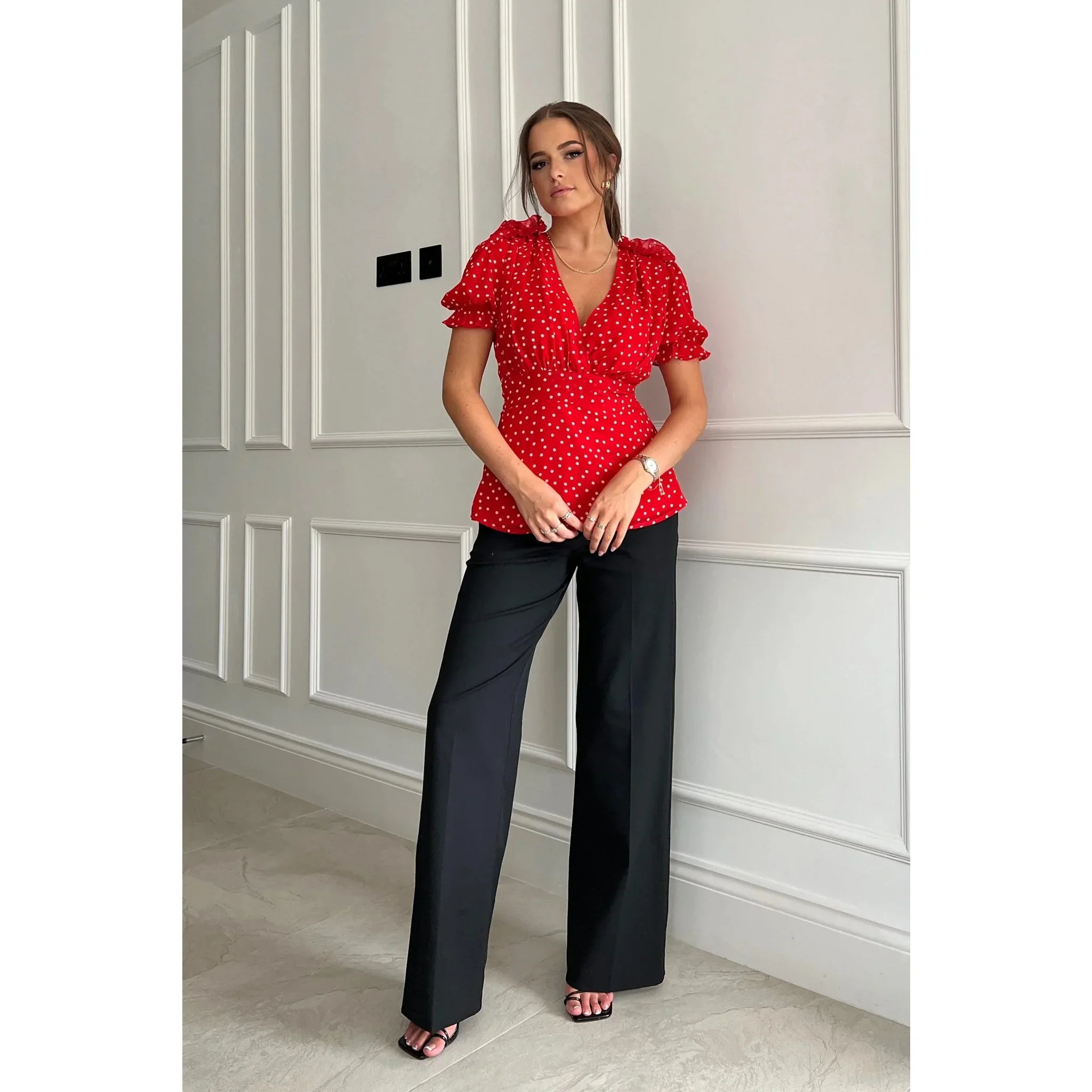 - Gorgeous Red & White Chiffon Polka Dot Top Featuring Delicate Shoulder Corsage Detail