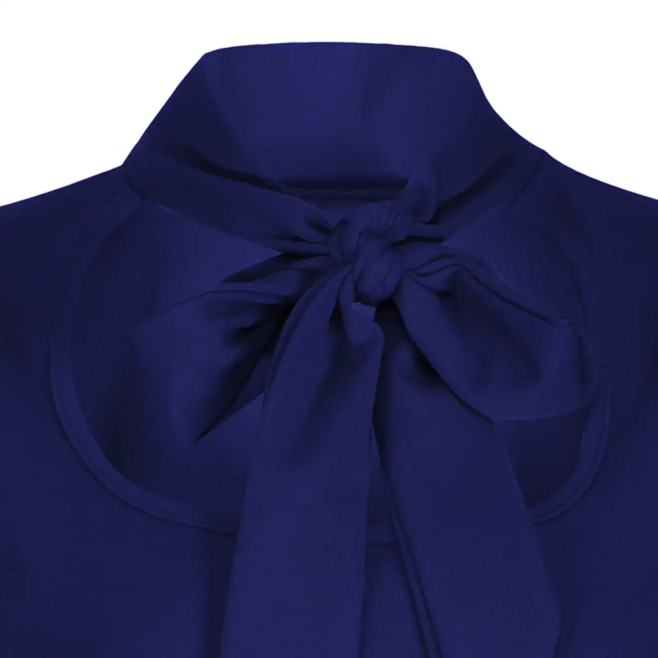 -70%Vintage Navy Blue Puff Sleeve Tie Neck Top—