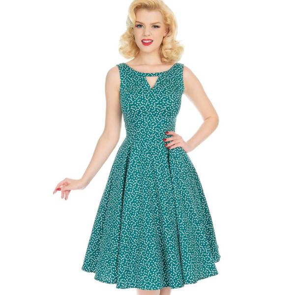 - Elevate your style with our exquisite Green And White Polka Dot 50s Cut Out Swing Dress. This stunning piece boasts intricate cut out detailing at the neckline, making it a must-have for any occasion this spring/summer. Crafted with side seam pockets and a concealed side zip, it offers both functionality and elegance.