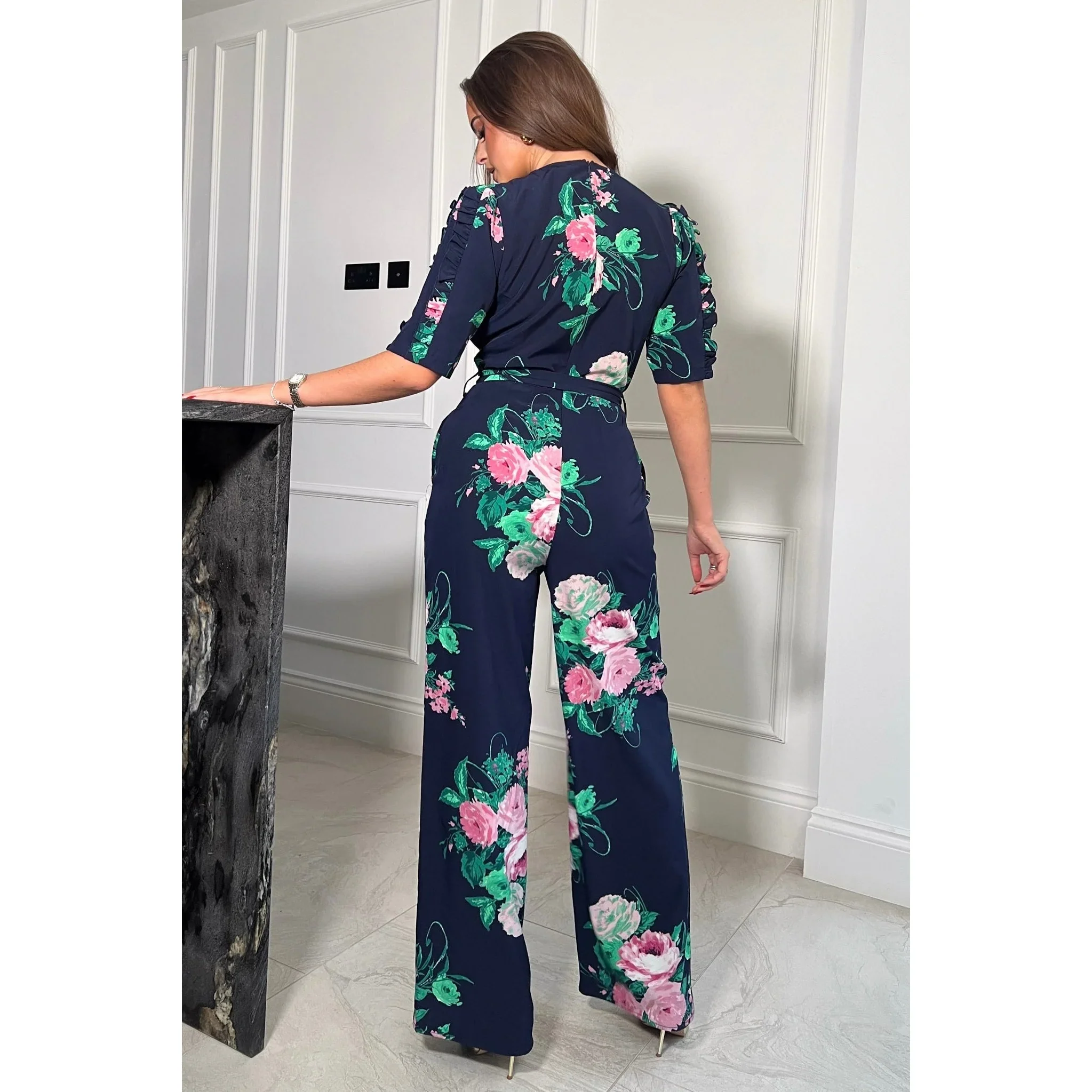 Navy Floral Wrap-over top Wide Leg Jumpsuit with Pockets