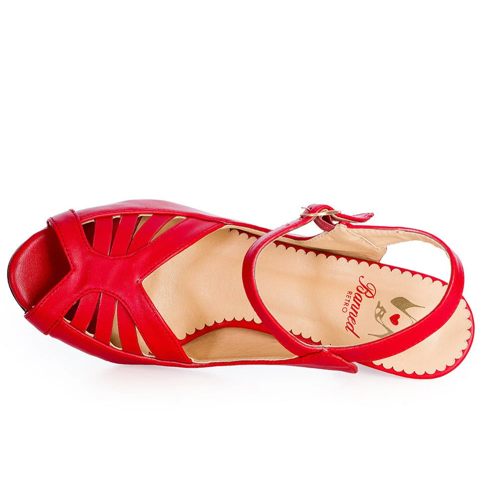 Inspired by the glamour of the 1940s, these luxurious peep toe heels feature a striking red cut out design. Elevate your style with these exclusive and sophisticated shoes that exude elegance. The perfect addition to your Pretty Kitty Collection!