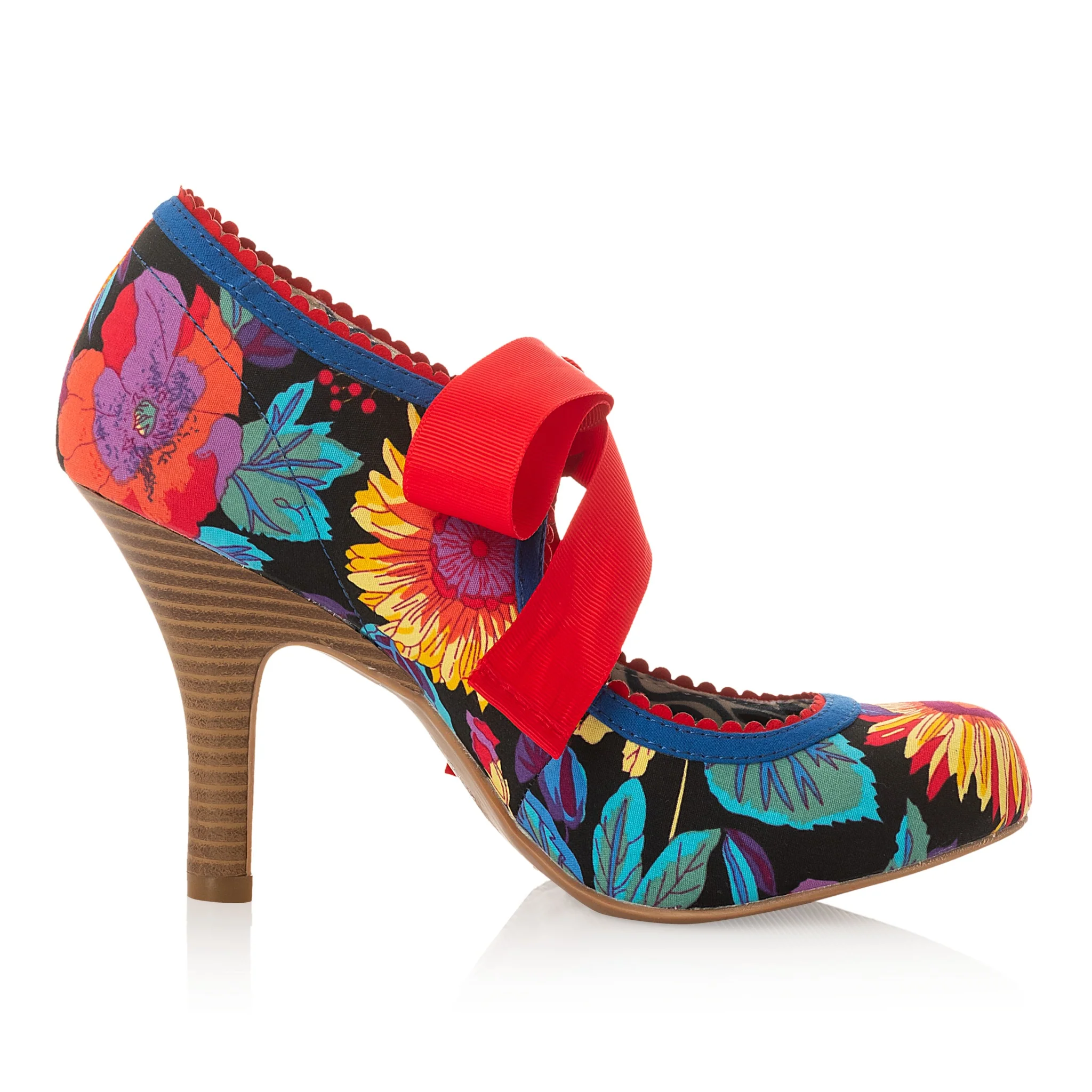 This Gorgeous Statement Heel Features A Bold Floral Print On A Black Backdrop, With Red Scallop Edging And Royal Blue Trim