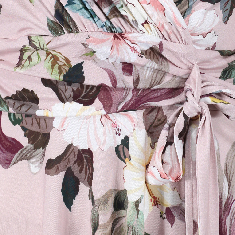 - Crafted exclusively for Pretty Kitty, this elegant dusky pink dress combines vintage-inspired design with contemporary sophistication. The plunging crossover neckline and luxuriously fluid fabric create an effortlessly graceful silhouette, while the empire waistline offers a flattering, forgiving fit. A coordinating fabric tie adorns the back neckline, complemented by a self-coloured decorative belt that defines the waist. The enchanting floral print—featuring soft naturals, pinks, and blues against the rich dusky pink base—adds timeless charm to this versatile piece, perfect for both special occasions and elevated everyday wear.